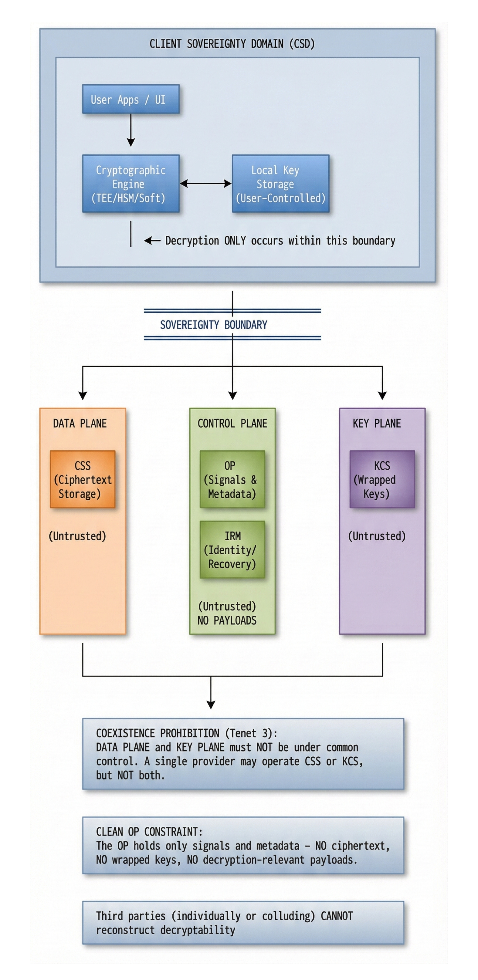 - No Cross-Talk: The Orchestration Plane (OP) MUST NOT process ciphertext from the Data Plane or keys from the Key Plane.